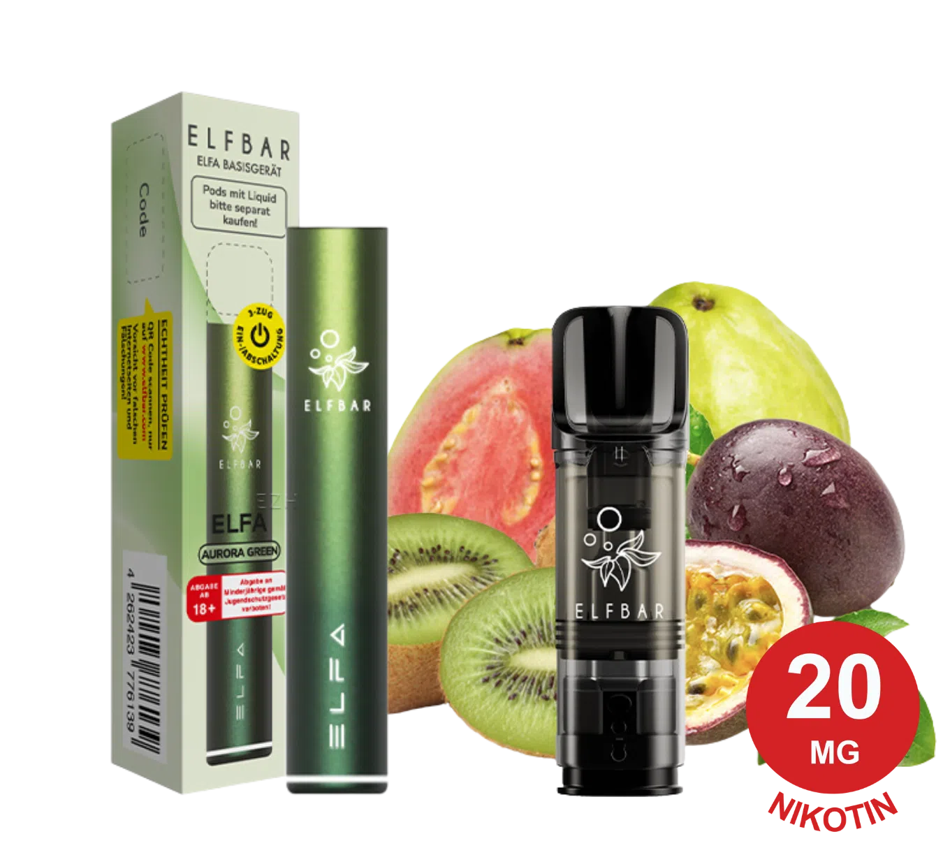 Das ELFA Probierset kombiniert das stilvolle und wiederaufladbare ELFA Basisgerät in der Farbe Aurora Green mit einem beliebten Kiwi Passion Fruit Guava Pod. Dank der vorbefüllten 2 ml Pods und dem integrierten Mesh-Verdampferkopf genießt du mit jedem Zug ein intensives Geschmackserlebnis.