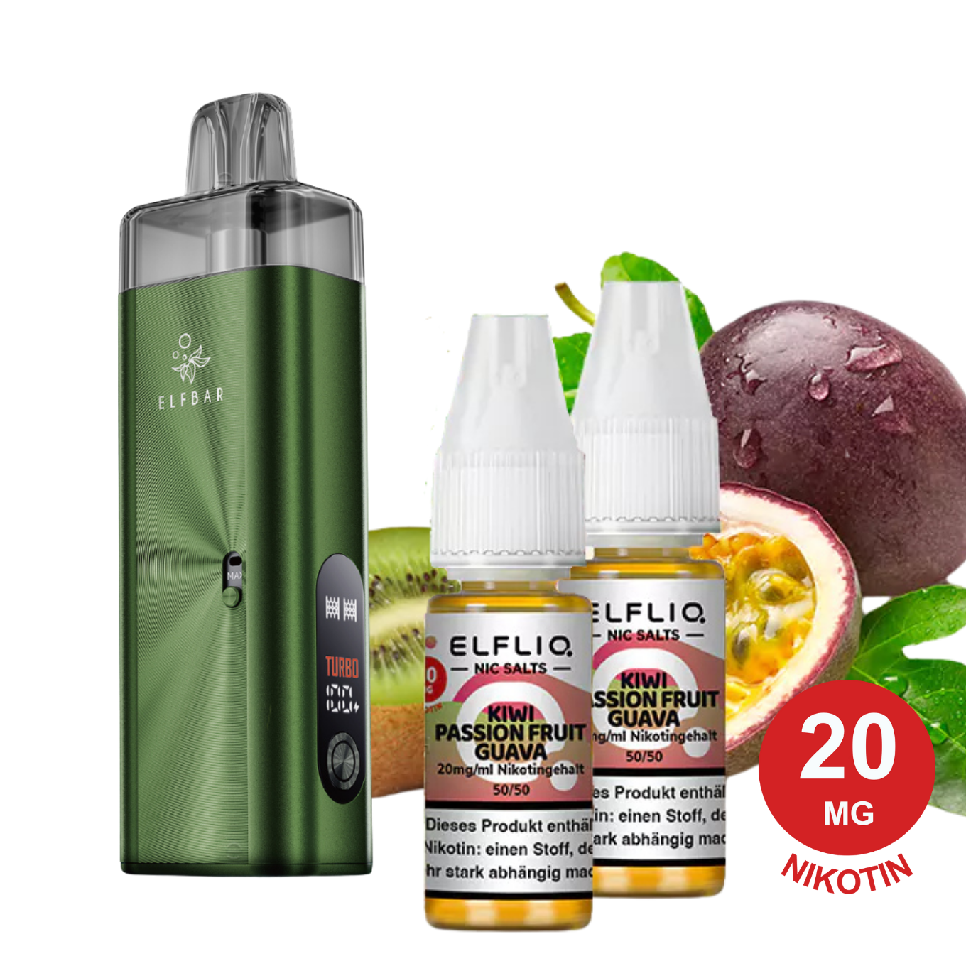 🥳 ELFX MEGA Green Kiwi Passion Fruit Guava Komplett-Set mit ELFX MEGA Refillable Kit (2800 mAh, 10 ml Tank) und 2 Elfliq Kiwi Passion Fruit Guava Nikotinsalz-Liquids.
