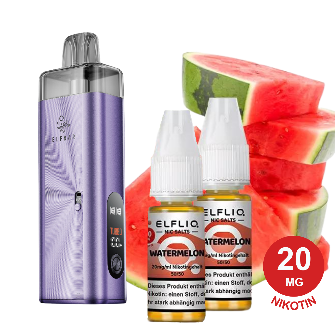 🥳 ELFX MEGA Purple Watermelon Komplett-Set mit ELFX MEGA Refillable Kit (2800 mAh, 10 ml Tank) und 2 Elfliq Watermelon Nikotinsalz-Liquids.