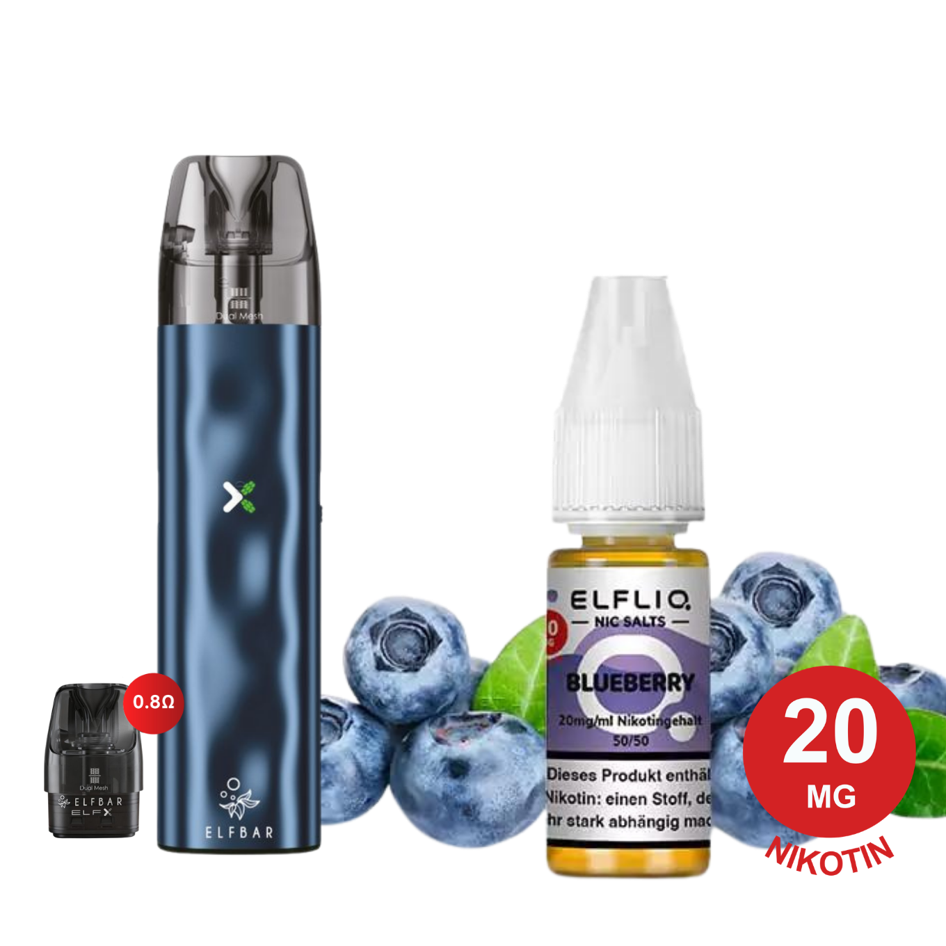 💙 Das ELFX Mini Probierset Ocean & Blueberry mit ELFX Mini Refillable Kit (1000 mAh, 2 ml Tank) und 1 Elfliq Blueberry Nikotinsalz-Liquid.