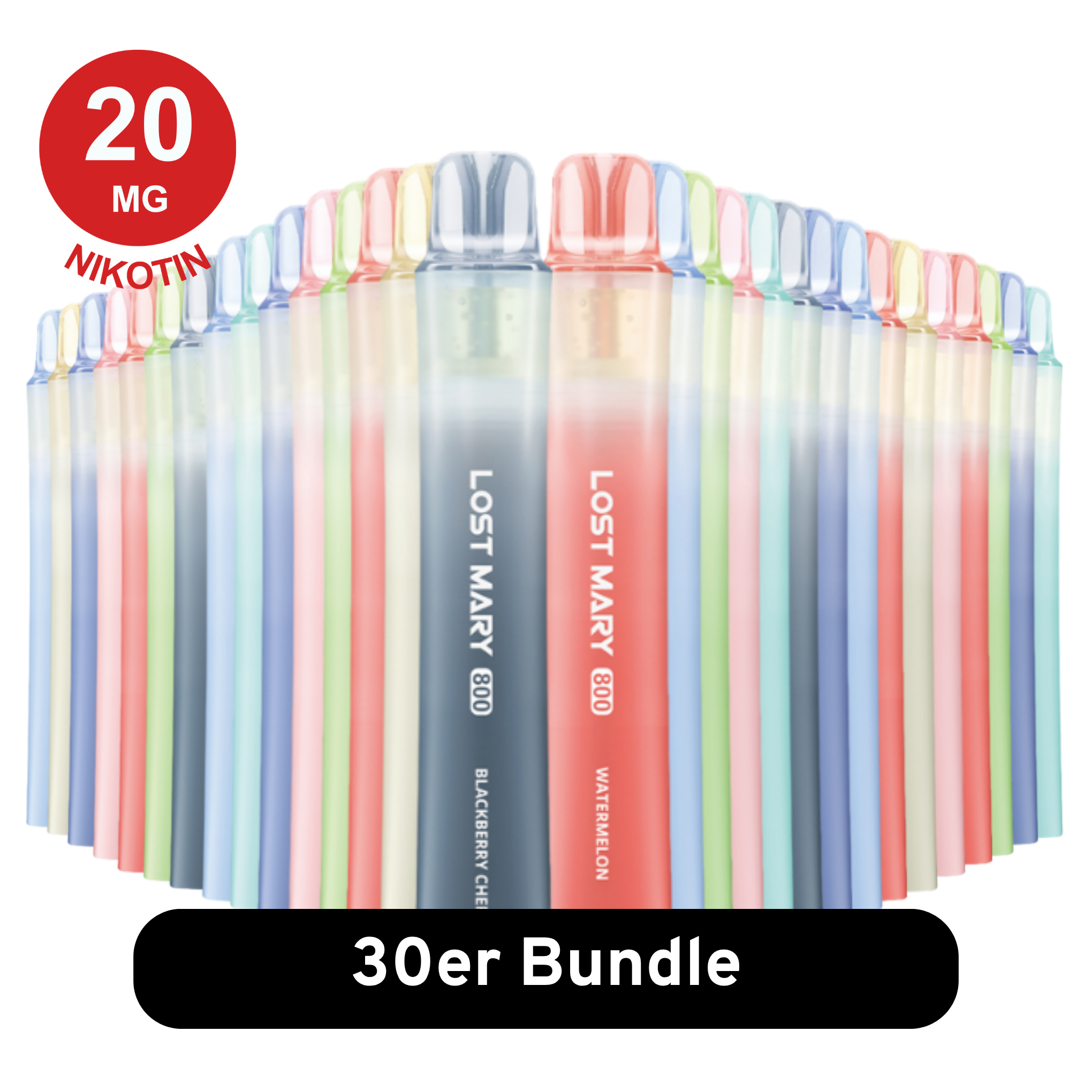 Die Lost Mary 800 Einweg E-Zigarette im frei wählbaren 30er Mix-Bundle. Stelle dir aus verschiedenen Geschmacksrichtungen deine persönliche Auswahl individuell zusammen.