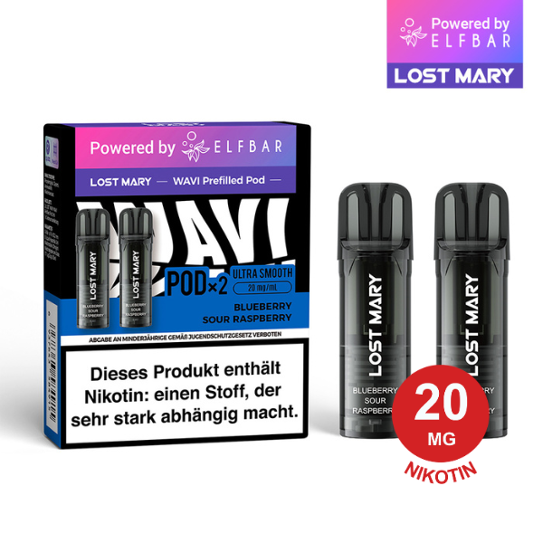 Die Lost Mary WAVI Blueberry Sour Raspberry Pods kombinieren saure Blaubeere mit süßer Himbeere. Das Ergebnis ist ein ausgewogener Sweet-&-Sour-Geschmack. Ideal für Dampfer, die fruchtige Aromen mit leichter Säure bevorzugen.