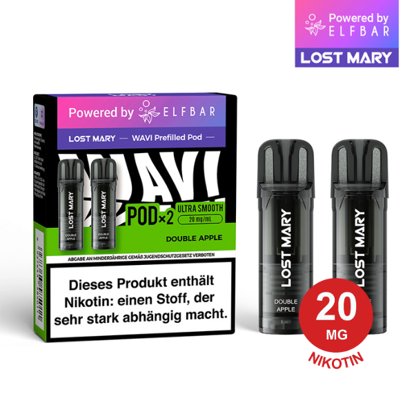 Die Lost Mary WAVI Double Apple Pods kombinieren zwei Apfelaromen zu einem runden und leicht süßlichen Geschmack. Kein Ice, keine Beeren, kein Menthol. Ideal für Dampfer, die klassische Fruchtaromen mit Tiefe bevorzugen.